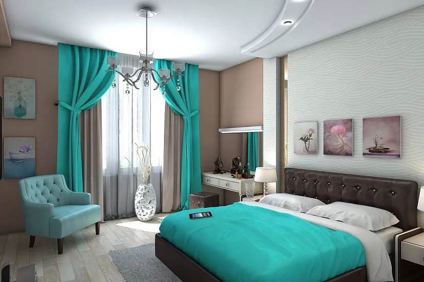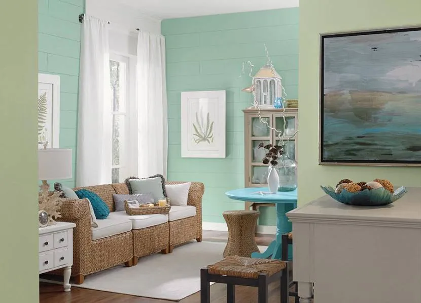По внешнему виду становится понятно, что домашняя комната, оформленная в светло-бирюзовом оттенке, создает легкую прохладу, подчеркивает уют и добавляет строгости.