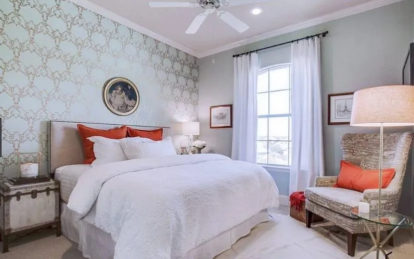Из рисунка подойдут цветы, вензеля, растительная геометрия. В качестве акцента можно у изголовья использовать 3д или обои с крупным узором.