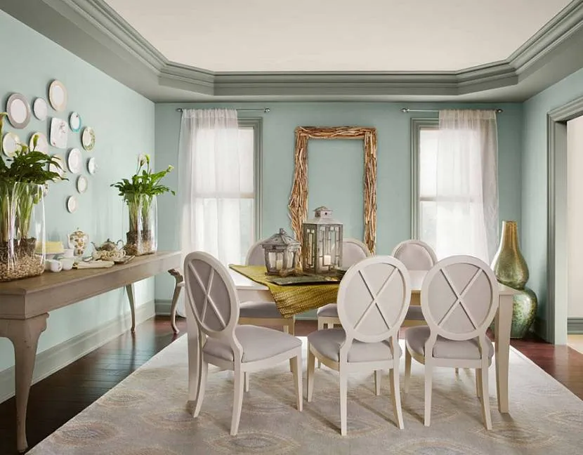 Привычная обстановка с участием светлой палитры будет эффектно смотреться на фоне мятного. В этом направлении интерьера одним из главных атрибутов считается гипсовая лепнина. Ее создают в золотистом или серебристом оттенке. Главное, чтобы при этом фон стен был мятным и занимал больше пространства, чем другие цвета.