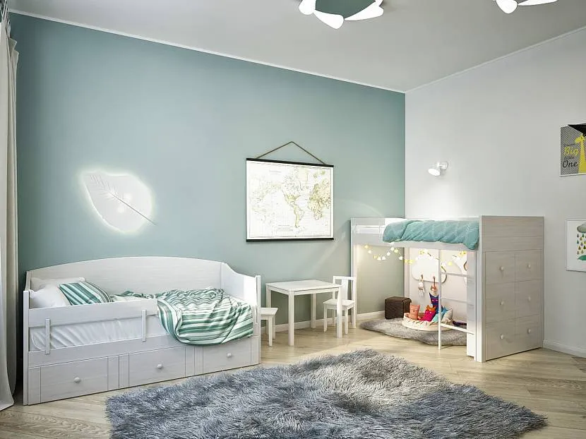 Данная комната в доме требует еще большей нежности и уюта. В детских может быть предусмотрено две одноярусные или одна двухъярусная кровать. При подобном оформлении стараются использовать текстиль мятного цвета. Сам каркас мебели стараются выбирать белого или кремового оттенка. Черты «зелени» повторяются в стенах и декоре.