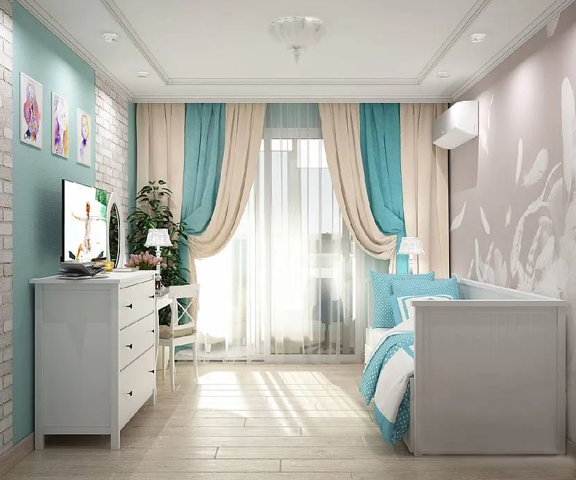Детская спальня в современном стиле и направлении лофт удачно примет подобные тона. Постельные принадлежности, шторы и другой текстиль имеют преимущественно бирюзовый оттенок. На некоторых предметах возможны интересные орнаменты и декор. Стены могут быть задекорированы самым различным способом: оклейка обоями, покраска с рисунком.