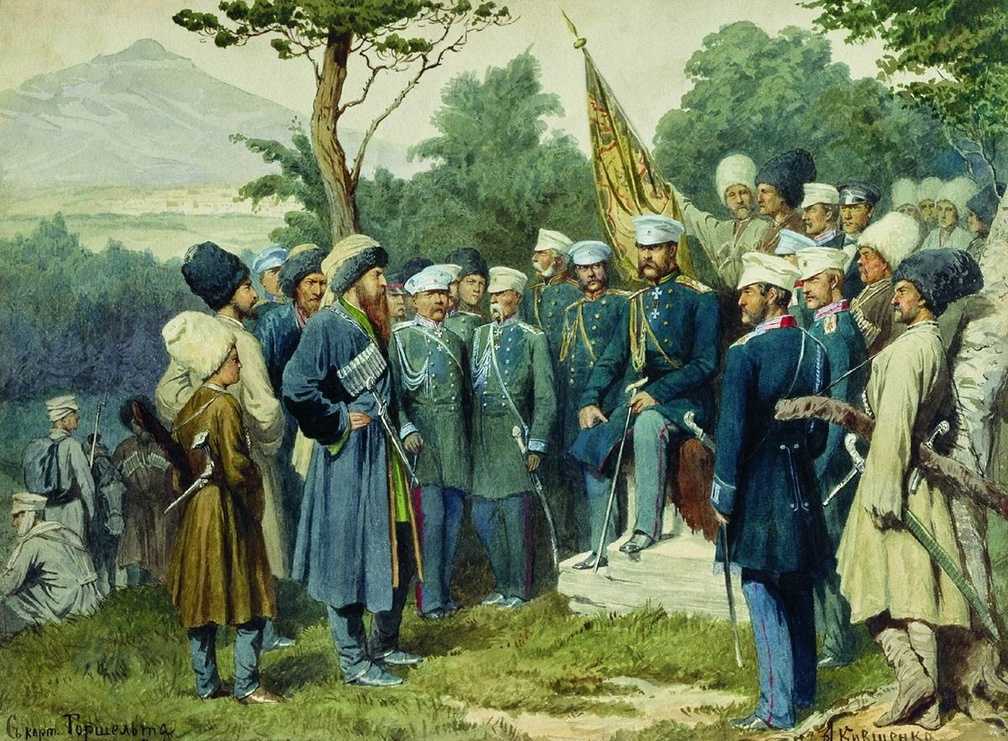 «Имам Шамиль перед главнокомандующим князем А. И. Барятинским, 25 августа 1859 года», картина А. Д. Кившенко. (wikipedia.org)