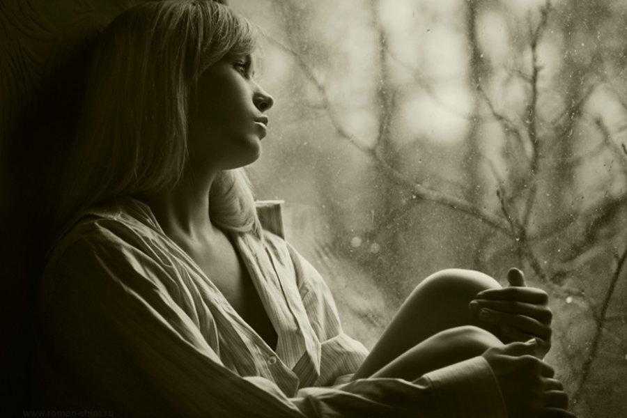 Грустная девушка сидит у окна.
