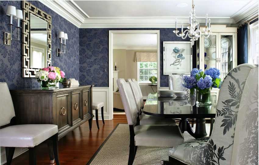 Кухня и столовая. Для кухни синий цвет является примером практичного фона. Такой фон без труда сможет спрятать небольшие подтеки воды, разводы и другие погрешности. Синие обои в помещении столовой лучше всего будут сочетаться с деревянной мебелью
