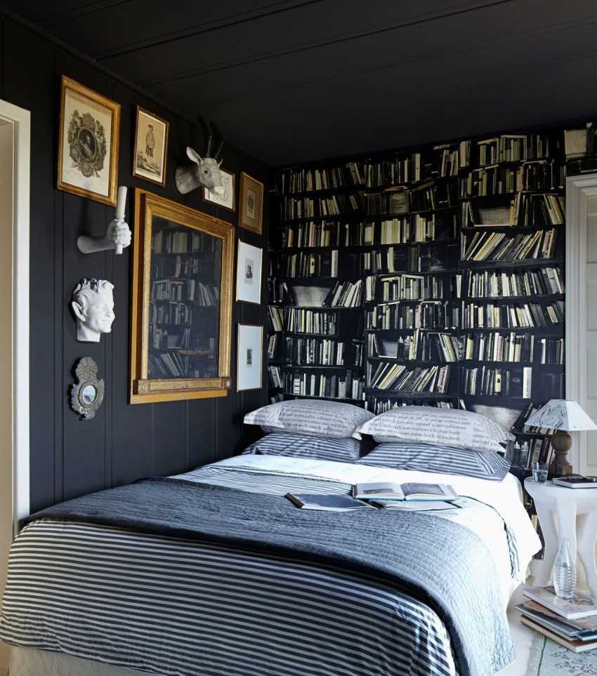 - В указанном интерьере вся суть заключается в игре на акцентах. Недостаточно просто поклеить темные обои, купить такое же покрывало на кровать и шторы. Спальня обязательно должна быть наполнена интересными декоративными вещами.