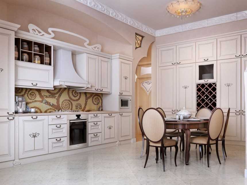 При подборе мебели необходимо руководствоваться одним правилом: гарнитур должен выглядеть богато и утонченно. Стол и стулья обеденной группы обычно сочетаются между собой. Подойдет стол из благородной древесины или стекла, а к нему – стулья с изогнутыми ножками и резьбой. Можно выбрать как мягкие сиденья, обитые бархатом или натуральной кожей, так и жёсткие – с металлическими элементами. В просторной кухне также ставится диван или уголок, создавая уютное место для приема гостей.