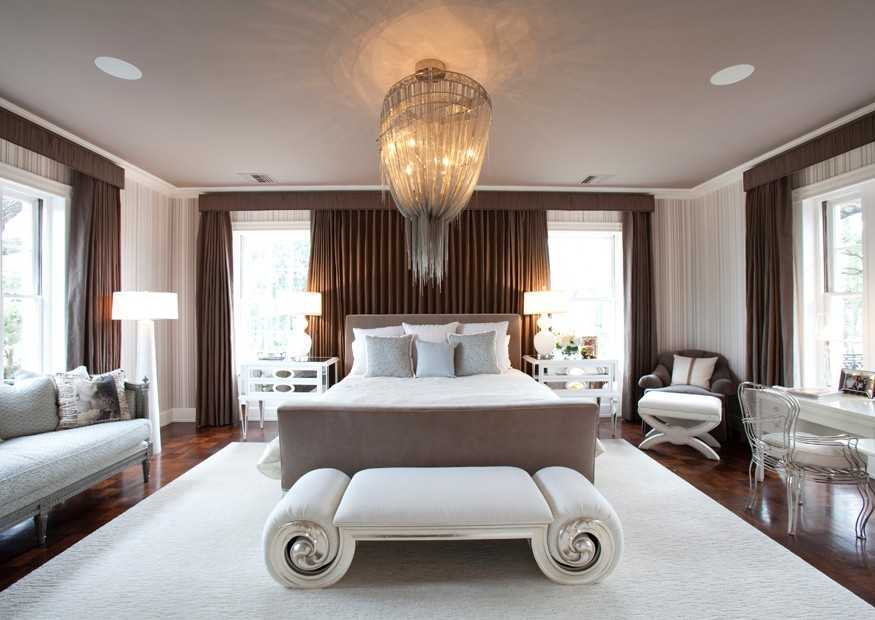 Оригинальность оформления спальни позволяет использовать большое количество зеркал, достаточного числа осветительных приборов, применение контрастов. Кроме этого, в отделке допустимо использование: