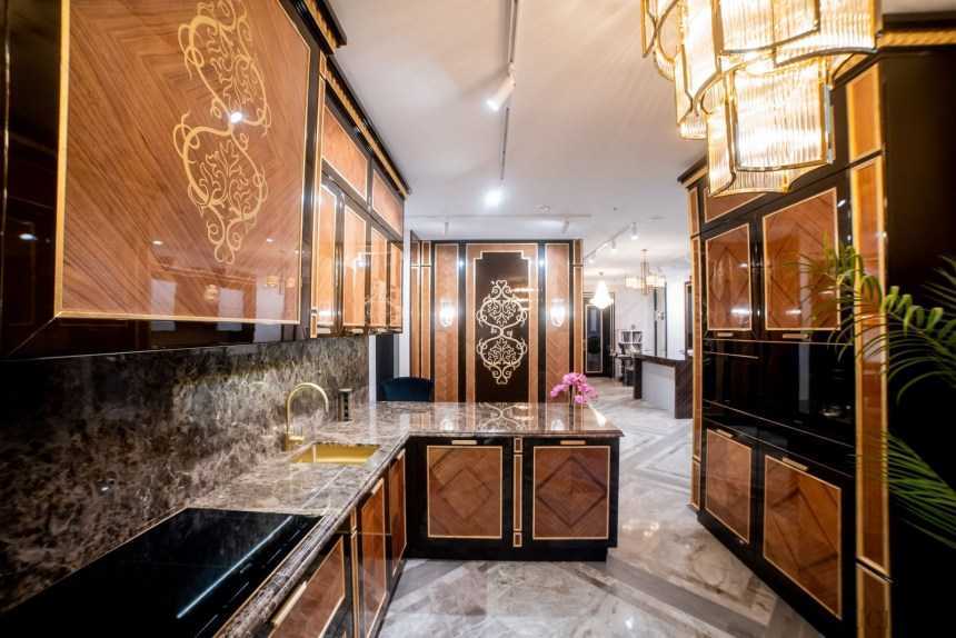 Гарнитур для кухни с дизайном арт-деко нужно выбирать неповторимый, привлекающий внимание своим массивным видом и многочисленными деталями, отличающийся функциональностью и удобством. Для такого интерьера подойдет мебель с замысловатыми силуэтами