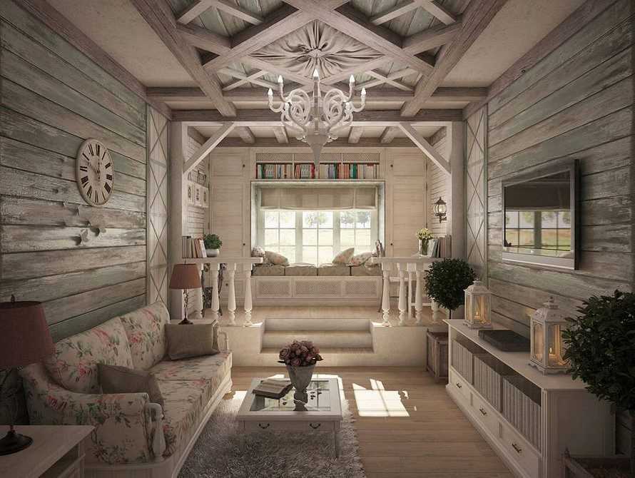 Другим отделочным материалом могут служить деревянные панели, которые обычно окрашивают в белый или бежевый цвет с сохранением (либо нет) древесного рисунка. На потолке можно расположить декоративные балки более темного цвета, чем остальная поверхность.