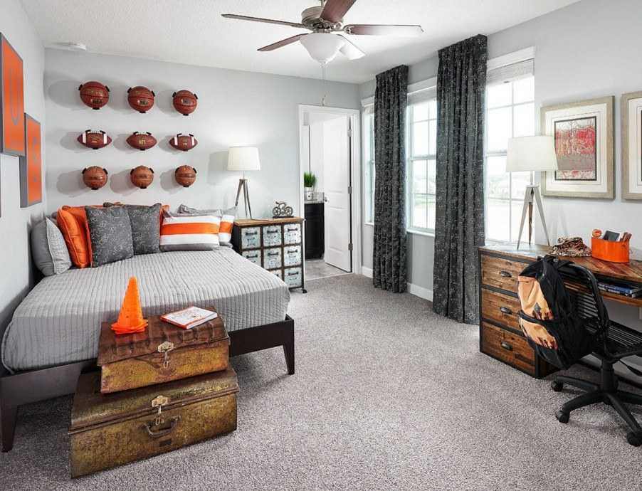 Чтобы пространство не казалось слишком насыщенным и загроможденным, можно сделать одну стену (которая находится позади спального места) нейтральной, а остальные – более яркими.