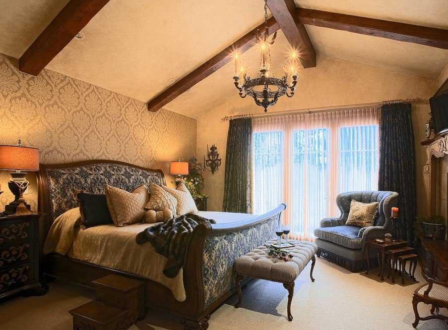 Основным, центральным предметом мебели в спальной комнате должна быть двуспальная кровать с деревянными резными или коваными металлическими спинками. Уместным считается наличие изящных тумбочек и комодов.