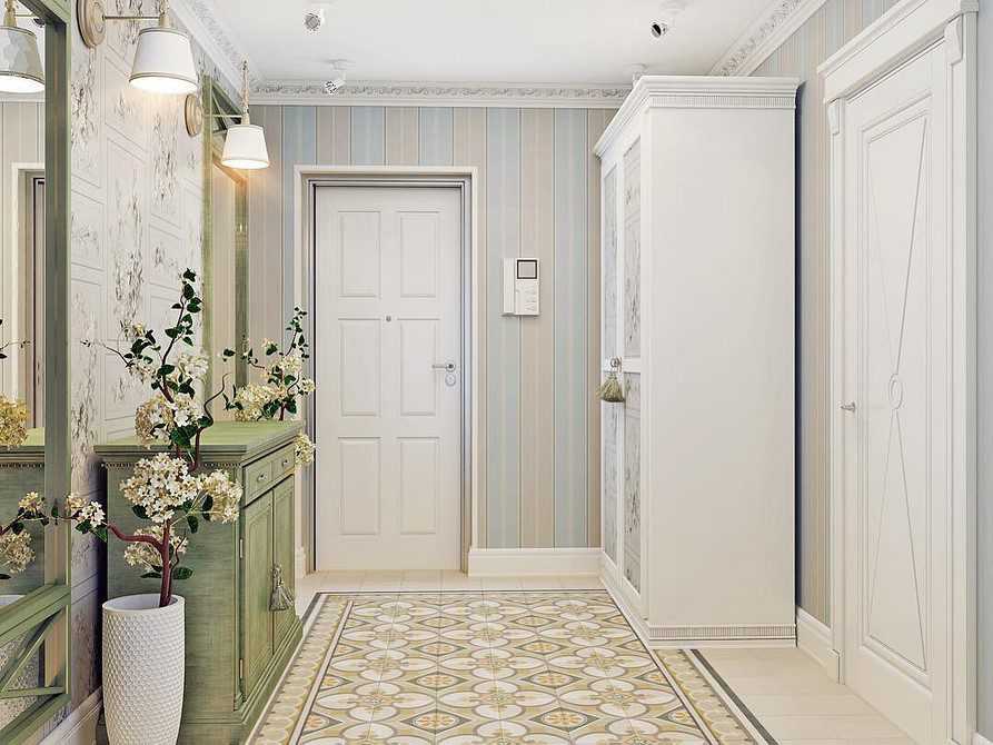 Идеальный выбор для прихожей – комбинированные цвета обоев, рисунки, орнаменты и простая функциональная мебель без дополнительного декорирования.