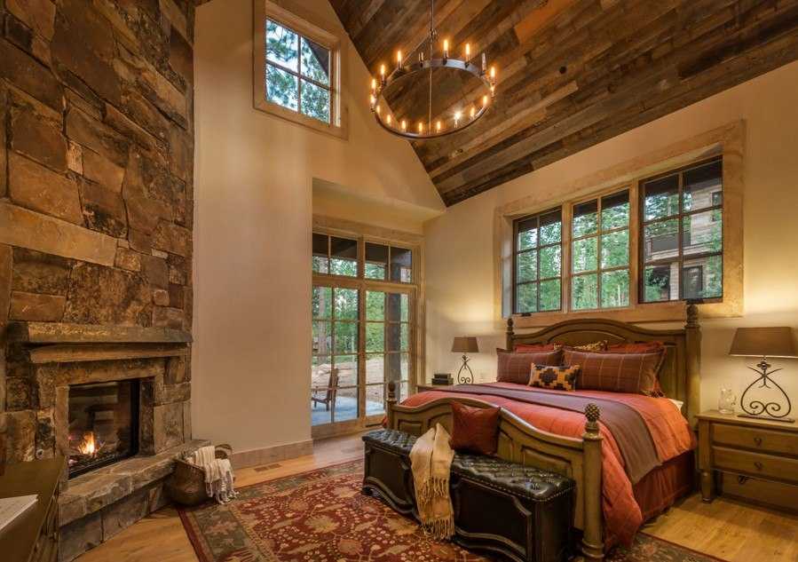 На фото спальня в стиле прованс с отделкой стен фотообоями. Стилизованный камин делает интерьер уютным и колоритным.