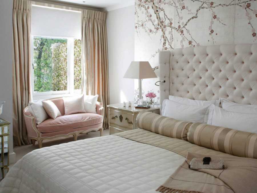 Стены отделанные обоями с мелким принтом создают легкое игривое настроение, однотонные фактурные полотна подходят для спокойного интерьера, а поверхности с фотопечатью делают комнату «живой», создавая иллюзию продолжения пространства спальни.
