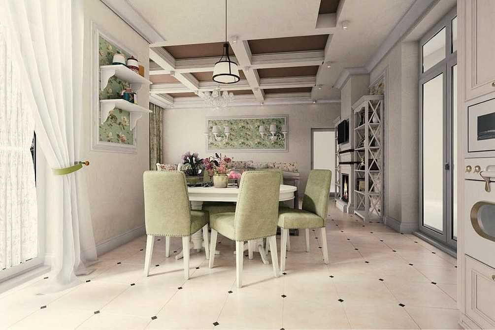 На фото просторная кухня-столовая в стиле прованс. Отделка выполнена обоями с разным рисунком, что визуально делит пространство на две зоны.